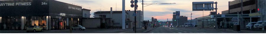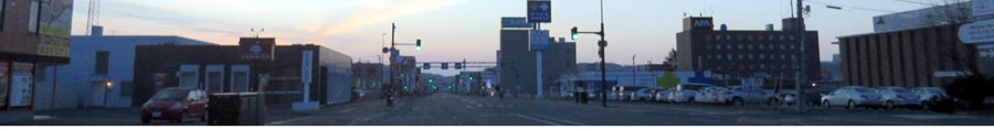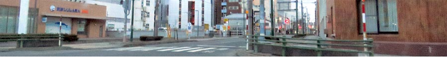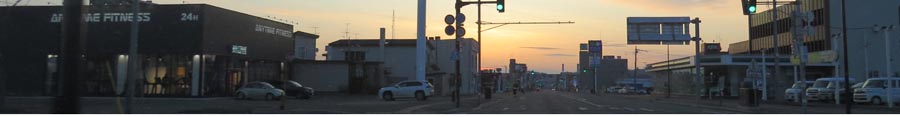 | 4月16日早朝、本町の国道39号を北見駅方向。前方奥は常磐通り等との五差路。 |