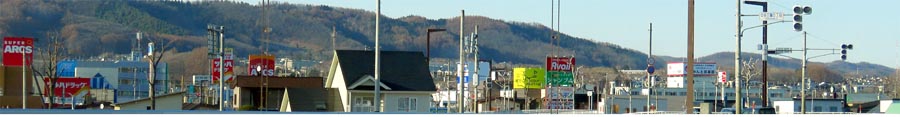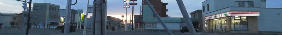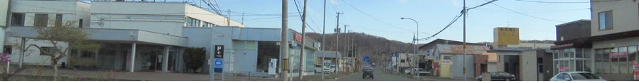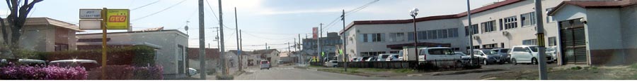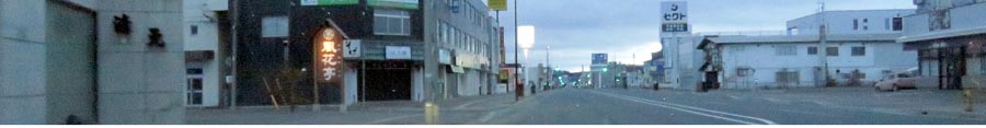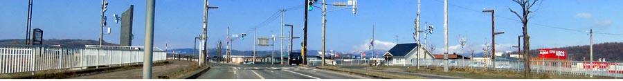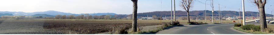| 4月11日早朝、末広町の南岸通り、野付牛自動車学校手前。正面下に自動車学校の教習コース。 |