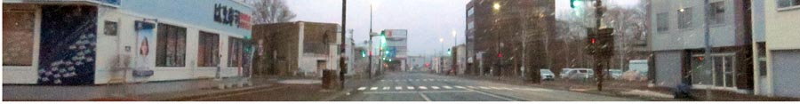 | 4月23日早朝、国道39号、北4条通り交差点手前から北見駅方向。写真奥が五差路。 |