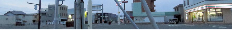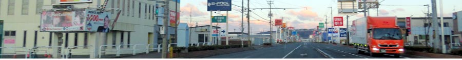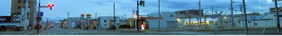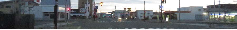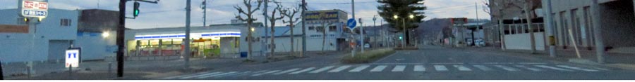 | 4月2日早朝、本町の国道39号をローソン前から緑園通り方向。写真奥が常盤町の五差路。 |