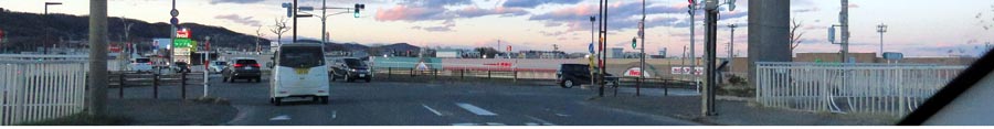 | 4月11日午後5時50分、西6号線豊大橋の南大通り交差点を京セラ側から国道39号方向。前方右にメッセ。 |
