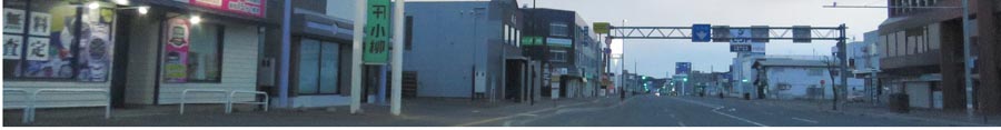 | 4月18日早朝、とん田通りの国道39号交差点から右側、北見駅方向。 |