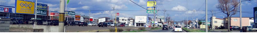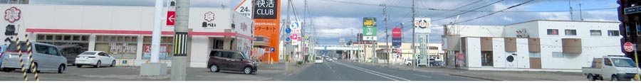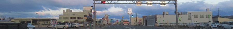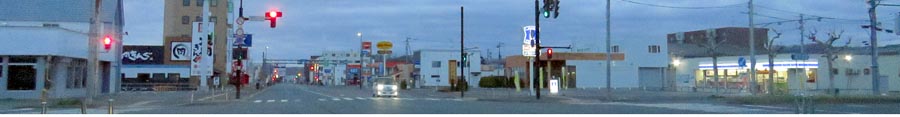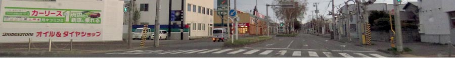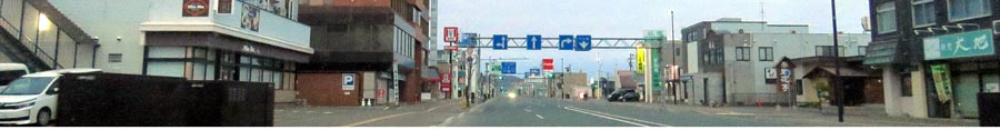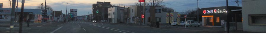 | 4月21日早朝、国道39号、緑園通り交差点から北見駅方向。写真奥が五差路、ここの交差点を右折で常盤公園方向。 |