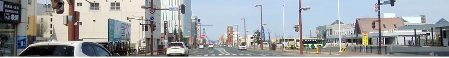 | 4月17日早朝、本町の国道39号緑園通り交差点から、常磐通り等との五差路方向。 |