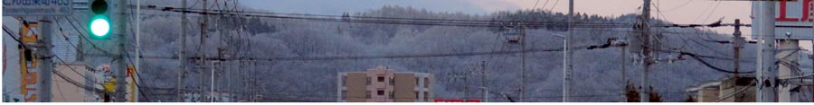 | 4月25日早朝、西3号線とん田通りの南大通り交差点から奥、無加川越に中の島背後の山が真っ白。外気温は氷点下。 |