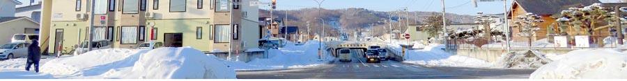 | 2月6日午後、錦町の南岸通りを野付牛自動車学校側から常磐通り方向。前方の交差点を右折すると北光幼稚園。 |