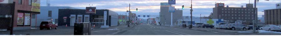 | 3月5日早朝、北3条通りの西2丁目通り交差点から中央通り方向。写真右が国道39号側。 |