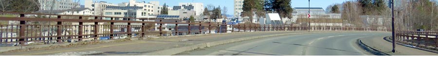 | 3月18日午前10時半過ぎ、東陵町の夕陽ケ丘通り、野付牛公園の上に架かる橋から北見工業大学方向。写真右下が野付牛公園側。写真奥がスタバ工大前店方向。 |