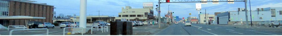 | 3月15日早朝、国道39号の北2条交差点。写真奥が常磐通り等との五差路、斜め右方向がハッカ記念館。 |