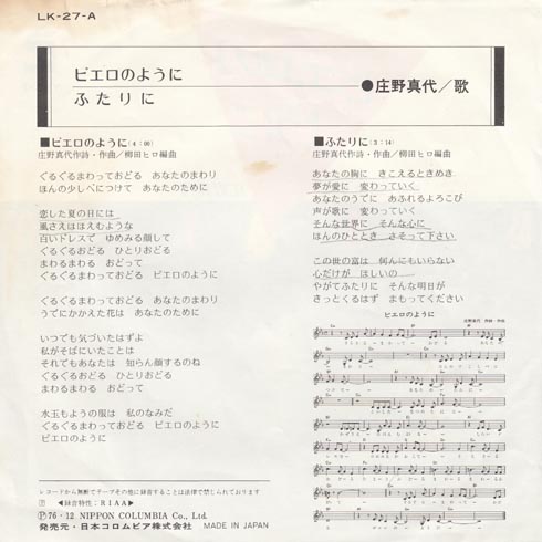 前のオーナーが鉛筆で歌詞に線をつけていますね。「恋した夏の日には 風さえほほえむような」悪くないけど、なんだろうなぁ。B面のふたりに、でも線がついてますが、好きだったんでしょうかなぁ。2曲とも作詞作曲が庄野さんですね。すごいですね。譜面が載っているのは当時っぽいですね。