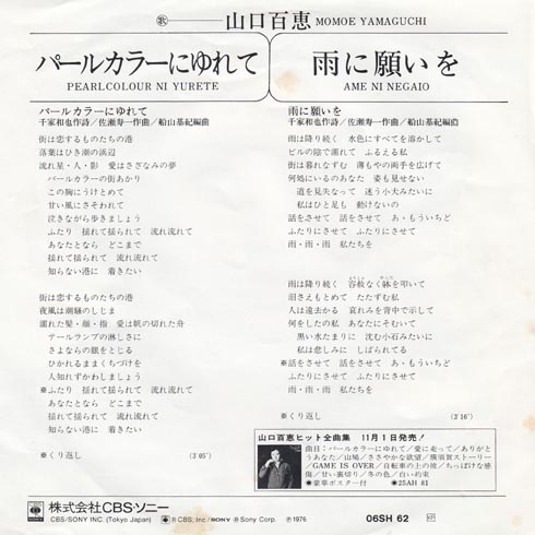 聞くとね、あぁ、山口百恵節って思う。ぱきっとしてないというか、ほんわけではないけどすっとくるみたいな。作詞はいつもの千家和也さんで、作曲は佐瀬寿一さんで、この方はもともと「ひらけポンキッキ」のスタッフだったので童謡もつくってまして、あの「およげたいやきくん」「パタパタママ」「ホネホネロック」も佐藤さんなんです。すごいですねぇ。