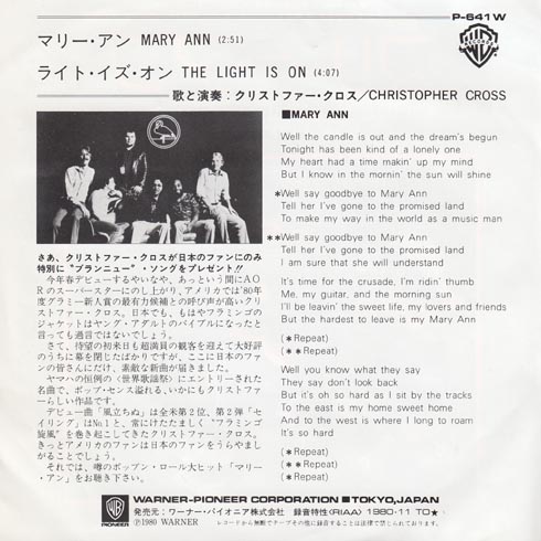 クリストファークロスさんの日本独自のシングル。ヤマハが主催する「世界歌謡祭」エントリー曲だったから、日本だけでシングルを切ったそうな。裏の写真では彼は中心で立っている人ですね。フラミンゴは彼のトレードマークだそうですが、ファーストアルバムにたまたまそれが選ばれただけで特に意味はないそうです。ちなみにこの時のグランプリはメアリー・マッグレガーさんの風に消えた恋だったそうです。はて?