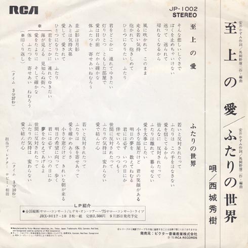西城秀樹さんの14枚目のシングルですね。下のほうにライブアルバムの告知がありますね。ヒデキ・オン・ツアー。73年くらいから毎年ライブアルバムを出してますね。しかもこのヒデキ・オン・ツアーはブロウアップ ヒデキというドキュメンタリー映画として封切になっているという。もういまのBTS状態ですね。みんな見たい!って感じだったのでしょう。福岡のコンサートではファンがステージに上がって秀樹さんを引っ張ってけがを負わせたらしい。すごい熱狂ぶり。さすが秀樹さん。