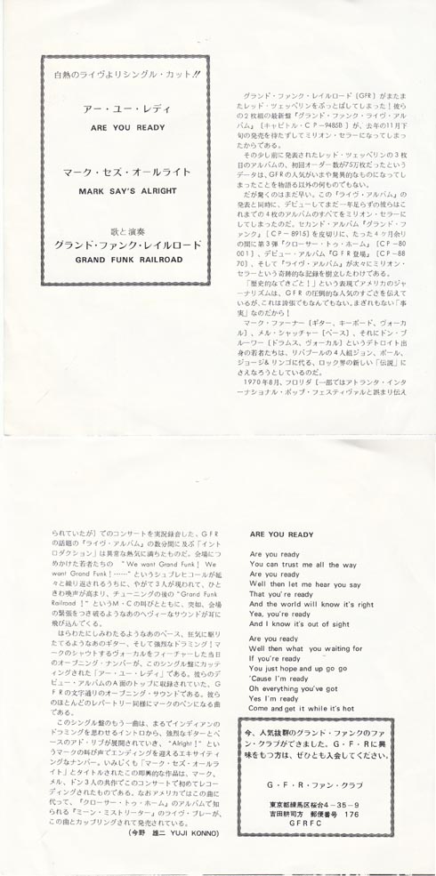 グランド・ファンク・レイルロードの3人編成時代のなんとライブシングルです。大ヒットになったライブアルバムからのシングルカットっていうか、そのまんまですね。まぁライブバンドですからね。このころまでは。巣g区荒々しくてかっこいいんですけど、グランドファンクになってからはポップなバンドになってしまって、あーあー、って感じ。まぁそれで売れたんだからいいか。