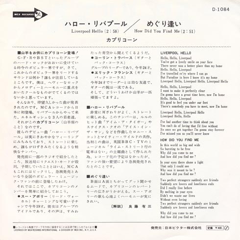 ハローハローって言った後にリバプールって歌っているんだろうけど、聞こえないっていう不思議な曲。解説によりますと、この曲はBBCのミュージカル「ライムストリート行の電車はない」の主題歌だったそうで、レコード化はなかったもののファンの要望によって発売ということだそうです。カプリコーンは山羊座のことです。