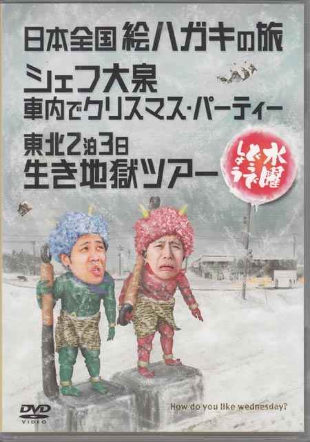 水曜どうでしょうDVD第13弾 日本全国絵ハガキの旅とシェフ大泉 車内でクリスマス・パーティーと東北2泊3日生き地獄ツアーが入っているDVD。確かなんかと一緒になっているのを買ったか、たくさんDVD あるのにかなりお安く買ったか。その理由はコピー物が数枚入っていたってことでした。絵葉書は好きな企画。表紙の絵は生き地獄ツアーの鬼の茶屋付近の田んぼの中でこんな格好で立たされた洋さんとミスターですね。右上には牛もいます。でもこの企画で一生どうでしょうしますっていう名言が生まれたんだからいい企画だよねぇ。 |