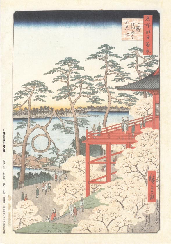 清水堂っていうのは上野寛永寺の清水観音堂のことらしいです。その清水観音堂を俯瞰してみえる「月の松」も描いてありますね。桜も描いていい感じです。この月の松は明治に台風でなくなって、2012年に復活したそうな。まぁ似てますけど。後ろの池が不忍池らしいです。
