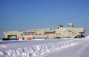| 道の駅「マリーンアイランド岡島」です。丘に上がった船です。枝幸町の観光物産の販売と食堂がありますが、冬季間はトイレ以外は閉鎖されています |