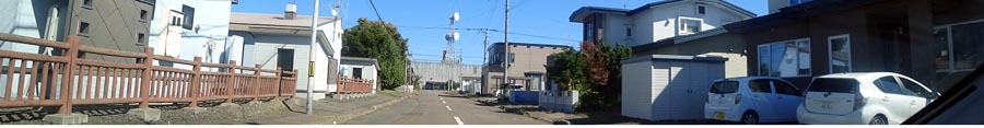 | 常盤橋側から花園町の南岸通りへ。写真右が無加川の右岸堤防、写真奥が野付牛自動車学校方向。 |