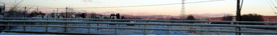 | 12月3日早朝、無加川橋から十勝連峰方向の景色。前日の夜に降った雪が若干残っていて、路面はじゃりじゃりな状況。 |