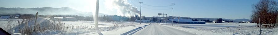 | 12月5日の朝、外気は氷点下10℃くらい。西6号線を豊地の京セラ側から北上へ。前方奥はビートを原料にした製糖工場、写真右が上常呂・訓子府方向。 |