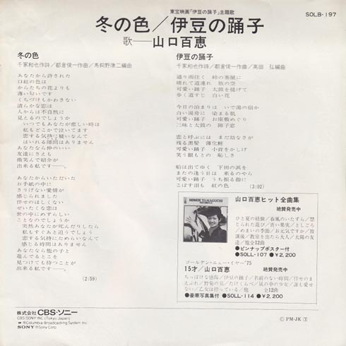 A面B面とも作曲は戸倉俊一さんなんですね。作詞:は千家和也さんで、麻丘めぐみさんやキャンディーズの作詞も手掛けていますが、山口百恵さんのを群を抜いて作詞してますね。B面は映画の主題歌なのにB面だなんてねぇ。今ならメインに据えますよね。当時は歌のほうが上だったのかな?