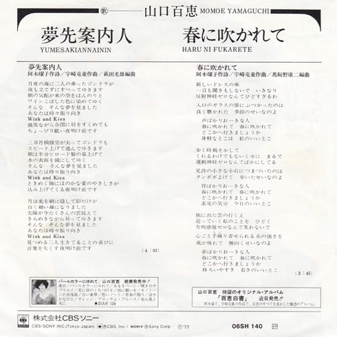 デビュー作「としごろ」からずっと千家和也さんが作詞ですが、このころになると作詞阿木燿子さん、作曲宇崎竜童さん夫妻で行うことが多くなってきました。曲調も山口百恵節っていうよりも、ポップさが出てきたような気がします。しかし、曲名をローマ字で書くってなんか意味があるのかな?日本人しか読めないでしょ。