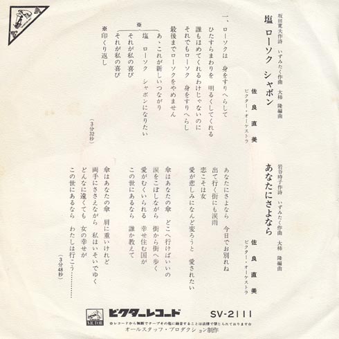 シャボンのところが文字が斜めっているのはわざと何ですかね?作詞の阪田寛夫さんは、童謡の「サッちゃん」や「おなかのへるうた」や「ねこふんじゃった」を作詞しているすごい人ですねぇ。合唱曲の「歌えバンバン」「マーチングマーチ」も作詞してますなぁ。しかしこの曲の作詞はどうですか。確かにローソクはそうでしょうが、塩とシャボンはどうなっているのか。そういう時代でしたか?1970年の唄でした。