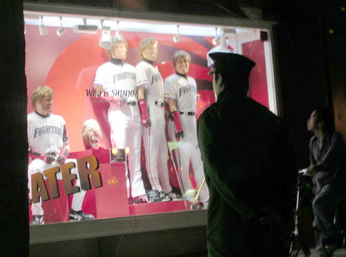 | 札幌市中心部にある札幌パルコ。ショーウインドーに 日ハムの新庄剛志選手にちなんだ「新庄シアター」という展示がされています。 新庄選手を模した「かぶりもの」、ダイヤを埋め込んだスパイク、「黄金バット」など がずらりと・・・。あるスポーツ紙は「秘宝館」のようだとも表現していましたね。 日中はカメラ付き携帯電話を持った若い人たちが、その「秘宝」を撮影するので にぎわってます。 夜中、酔っぱらってタクシーに乗り、その窓越しから、ウインドーを見たのですが、 展示されている物が「物」だけに、夜でも警備員が見張っているのには驚きでした。 展示は25日まで。 (札幌支局長・ぴかちゅ) |