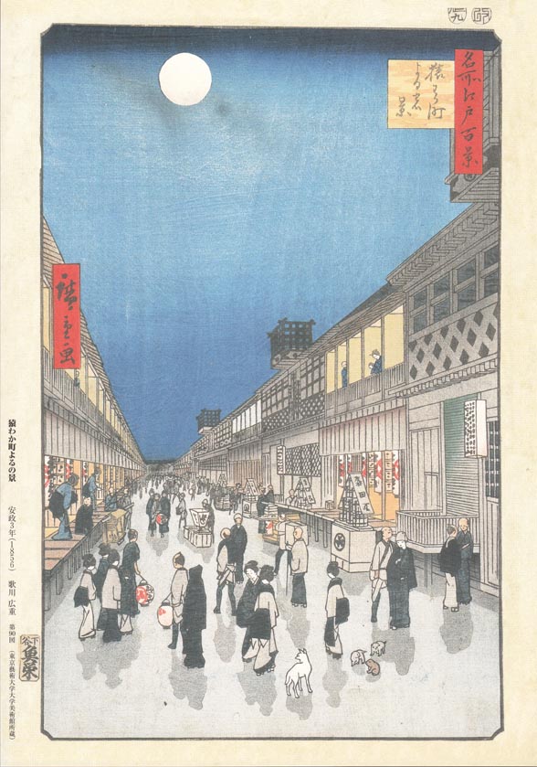 猿わか町は現台東区浅草6丁目付近らしいです。歌舞伎の江戸三座(中村座・市村座・森田座のちの河原崎座)があったそうで、右側が歌舞伎座でしょう。森田屋っていうのが見えます。もともとは山村座を入れて江戸四座だったけど、徳川家継時代に江島生島事件があっておとりつぶしになったんだよなぁ。大河ドラマ吉宗でもやってたわ。歌舞伎は火事がもとでこの地に左遷されたので夜は行わないので、この画では歌舞伎を見終わった人たちですね。お家に帰るところでしょう。月がいい味出していますね。