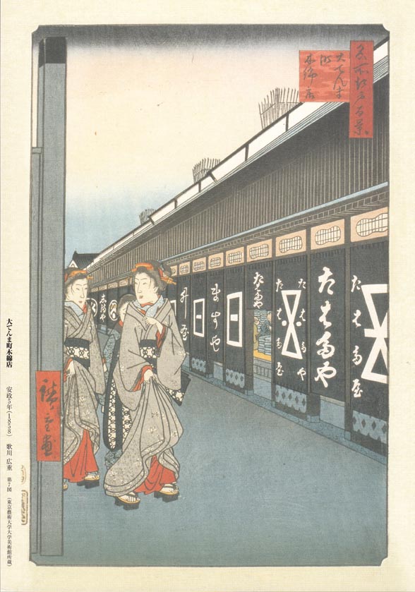 これも昨日の三井越後屋さんの宣伝用と同じで、木綿屋さんが頼んだと思われる。手前から「たばたや」、「ますや」、「しまや」っていう屋号が書かれているそうな。その前を芸者さんが歩いていますからね。今なら美人なアイドルさんがお店の前でポーズをとるって言う感じでしょうかね。CMですね。たぶん「たばたや」さんが一番多くお金を出したんでしょうなぁ。