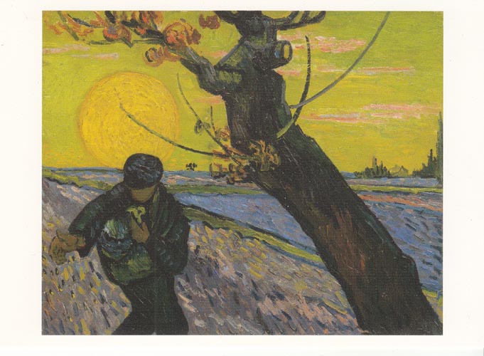 | 種まく人 山梨県立美術館にもミレーの種をまく人がありますが、その模写っていうかインスピレーションをもらって描きましたって感じかな。まく人はわかったとして、この木は何だ?と思うでしょ。たぶんこの木は日本の浮世絵ですね。ネットでは歌川広重の名所江戸百景「亀戸梅屋敷」の梅の木ではないかとかかれていました。まぁ当時は日本ブームですからね。浮世絵の画が輸入品の包み紙として一緒にオランダに輸入されていたんだと。それを見てゴッホさんたちが面白かったと山田五郎さんが言ってました。ゴッホさんの弟さんは画商でしたからねぇ。これもお姉ちゃんのお土産。ありがたい。 |